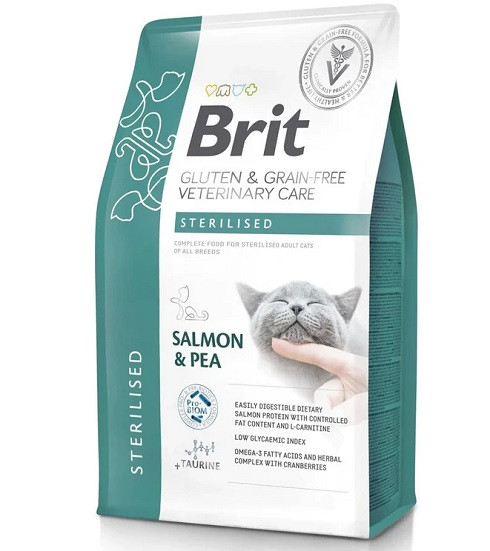 A Brit Veterinary Diets egy gabonamentes állatorvosi táp ivartalanított macskák számára, lazaccal és borsóval.