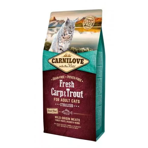 Carnilove Fresh Adult Cat Carp&Trout Sterilised - Ponty és Pisztráng Hússal 6kg megbízható minőségű termék. Összetétele és kialakítása a mindennapi igényeket szolgálja. Részletes adatokért lásd a termékleírást és a csomagolást.