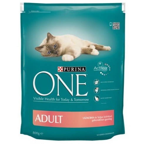 ONE Száraz Macska Adult Lazac+Teljes Kiőrlésű Gabonák 800g kiváló minőségű macskatáp, amely támogatja a macskák egészségét és vitalitását. Kiegyensúlyozott összetételével hozzájárul az immunrendszer és az emésztés megfelelő működéséhez.