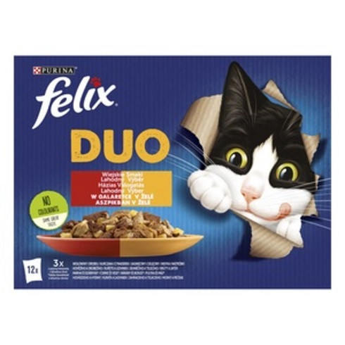 A FELIX DUO ellenállhatatlan eledelek választékát kínálja olyan étvágygerjesztő látvánnyal, illattal és ízzel, mintha te magad készítetted volna! Minden receptúra minőségi összetevőkkel készül és kétféle, finom ízű, puha falatkákat tartalmaz aszpikban, így cicád egyszerre élvezheti két kedvenc ízét egyetlen ízletes eledelben! A FELIX DUO receptúrák Omega-6 zsírsavak forrásai, és megfelelő arányban tartalmaznak vitaminokat, hogy 100%-osan kielégítsék cicád napi tápanyagszükségletét, amennyiben követed a csomagoláson lévő etetési útmutatót. Ez még nem minden! A FELIX DUO eledelek széles ízválasztékban és zamatos aszpikban kaphatók, hogy kielégítsék cicád változatos igényeit. Valóban kétszer olyan ízletesek! FELIX - Egyszerűen ellenállhatatlan!